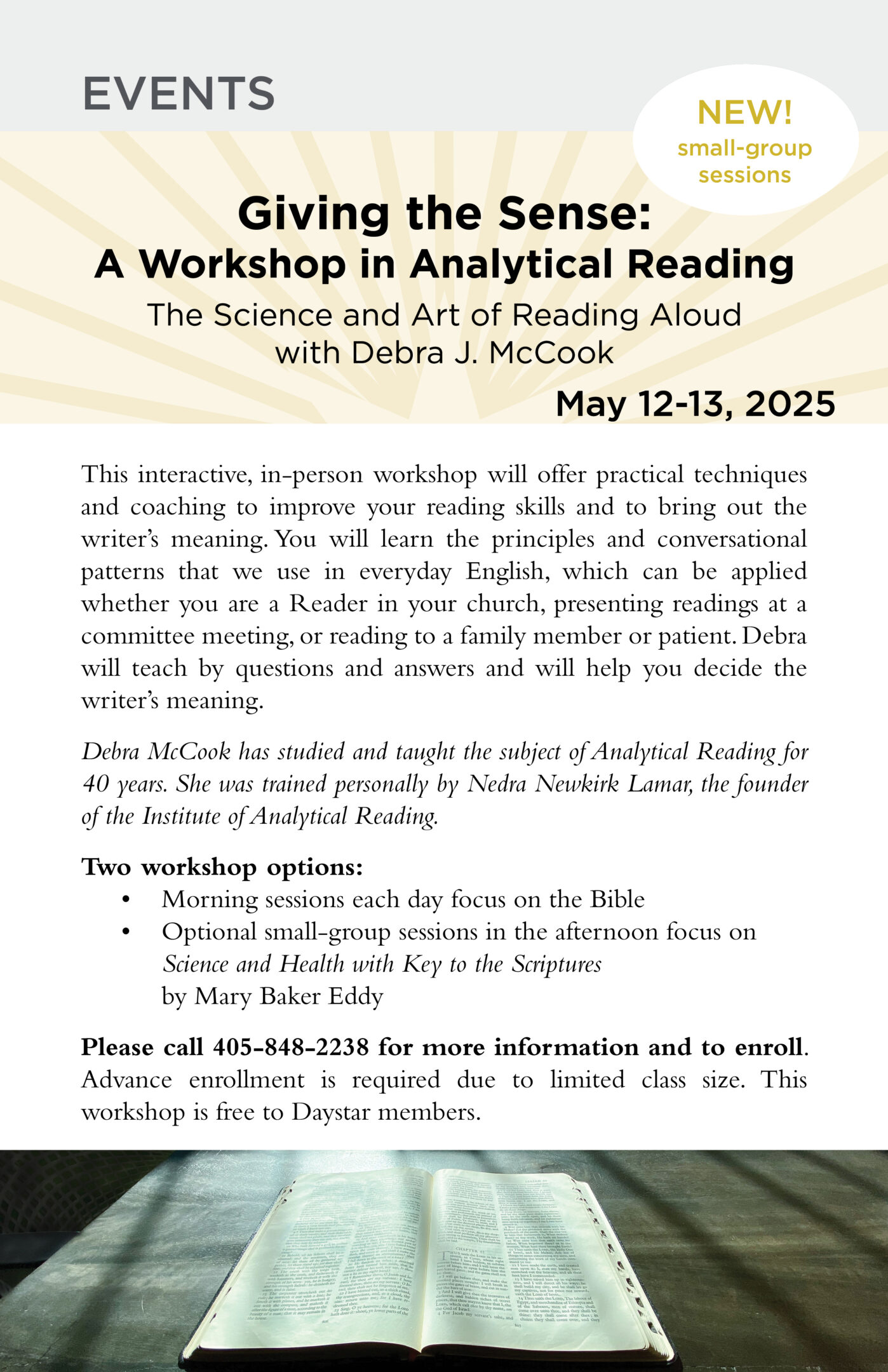 Please call 405-848-2238 for more information and to enroll. Advance enrollment is required due to limited class size. This workshop is free to Daystar members.