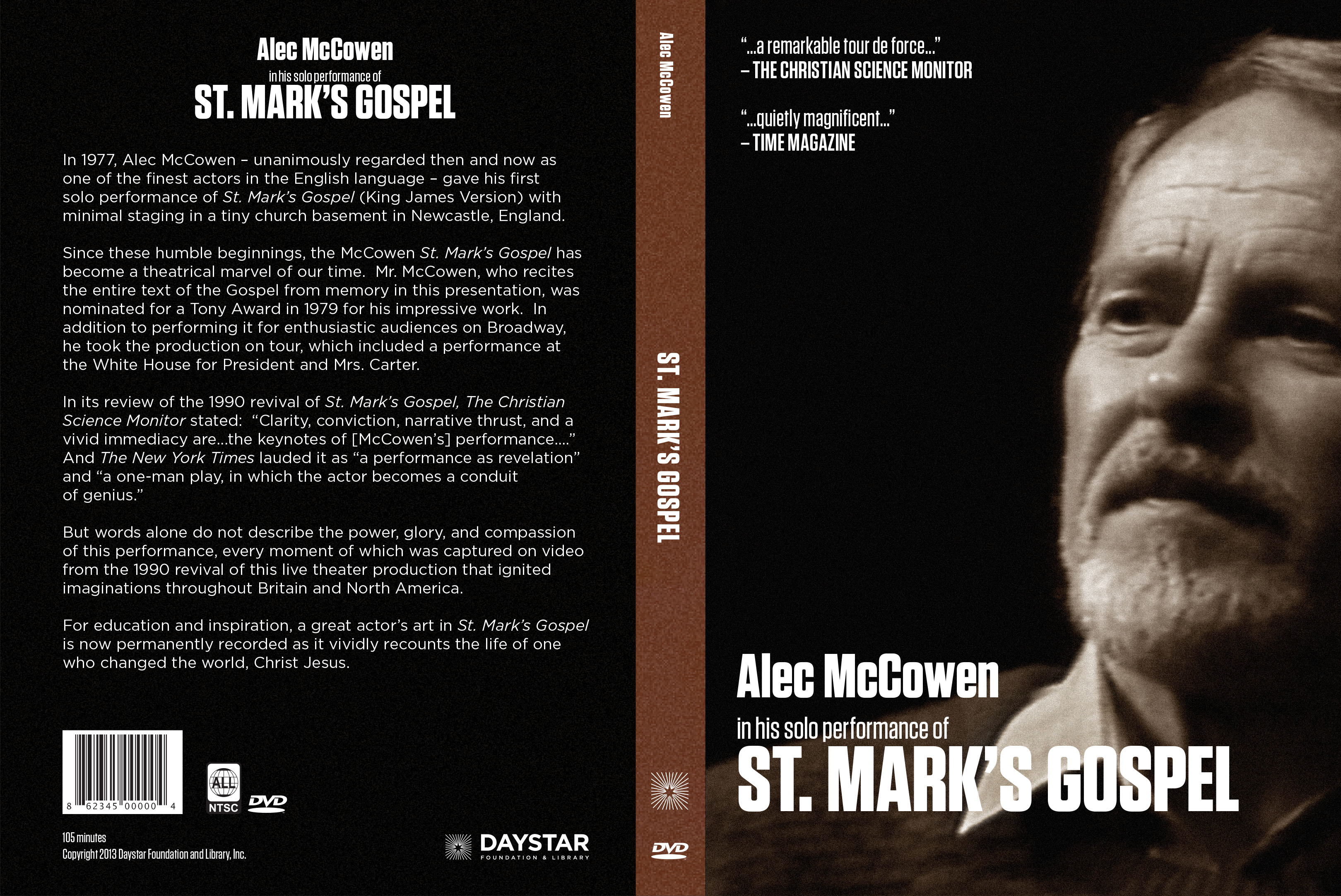 Daystar Foundation and Library presents the re-release, on DVD, of Alec McCowen’s 1990 solo performance of St. Mark’s Gospel. McCowen, who recites the entire text of the Gospel from memory in this presentation, was nominated for a Tony Award in 1979 for his impressive work.